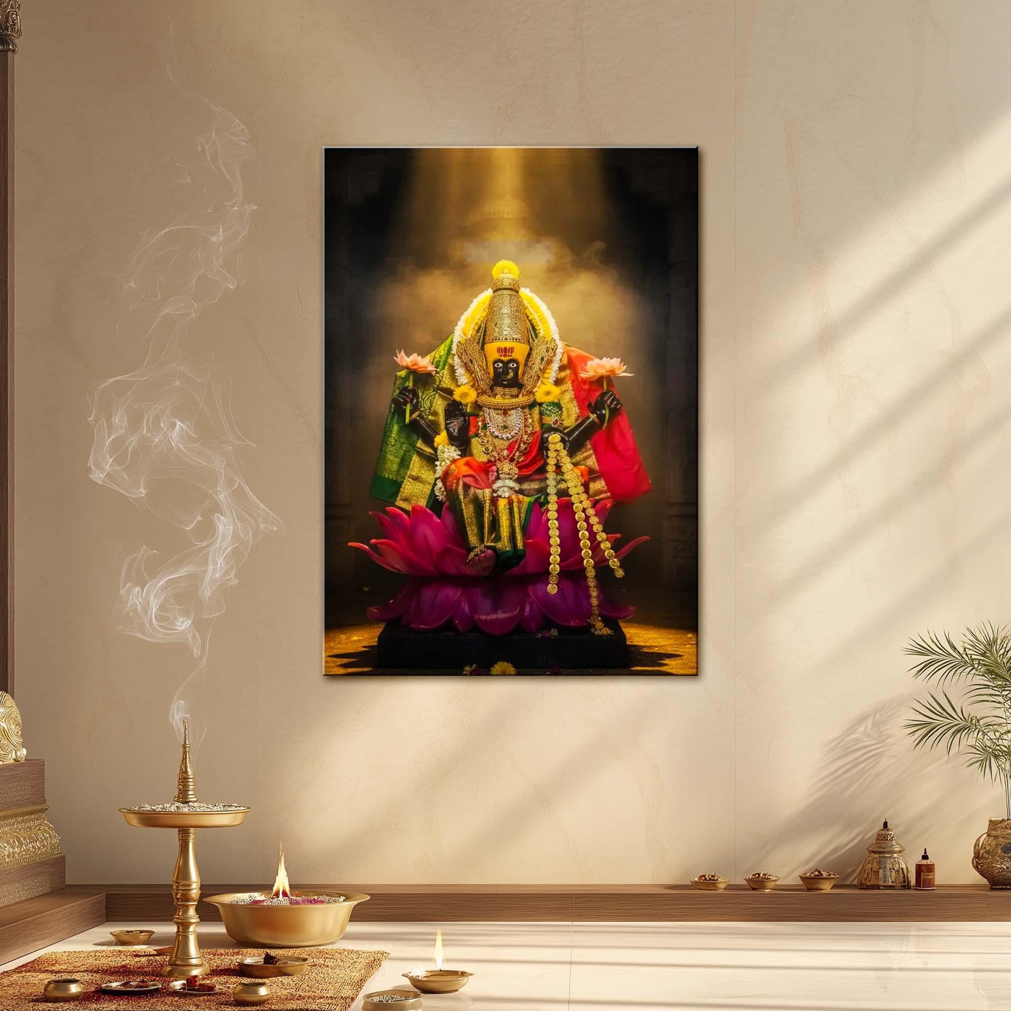 Holding lotus flowers in her divine hands, the Goddess blesses devotees with spiritual purity, material fulfillment, and unwavering protection. The lotus throne beneath her signifies victory over adversity—rising untouched from darkness into divine grace. Every detail of this artwork echoes the sacred power felt by millions who bow before her at the revered Karvir Peeth.