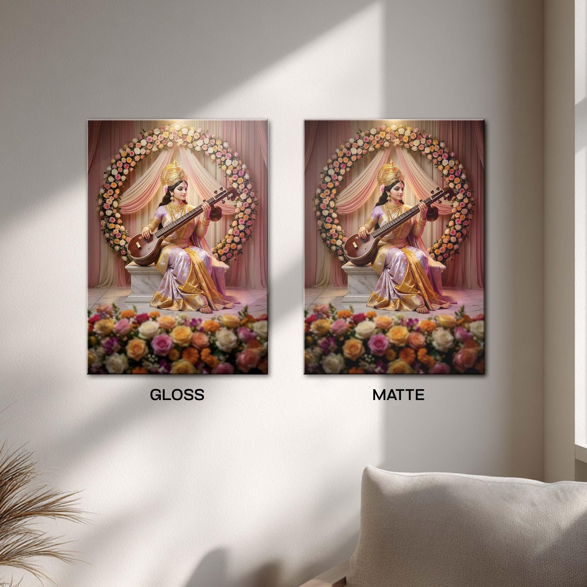 The delicate drapery, blooming flowers, and warm tones create a celestial stage-like atmosphere, reminding us that true knowledge is both sacred and beautiful. This artwork celebrates learning as a form of devotion and music as a divine language.