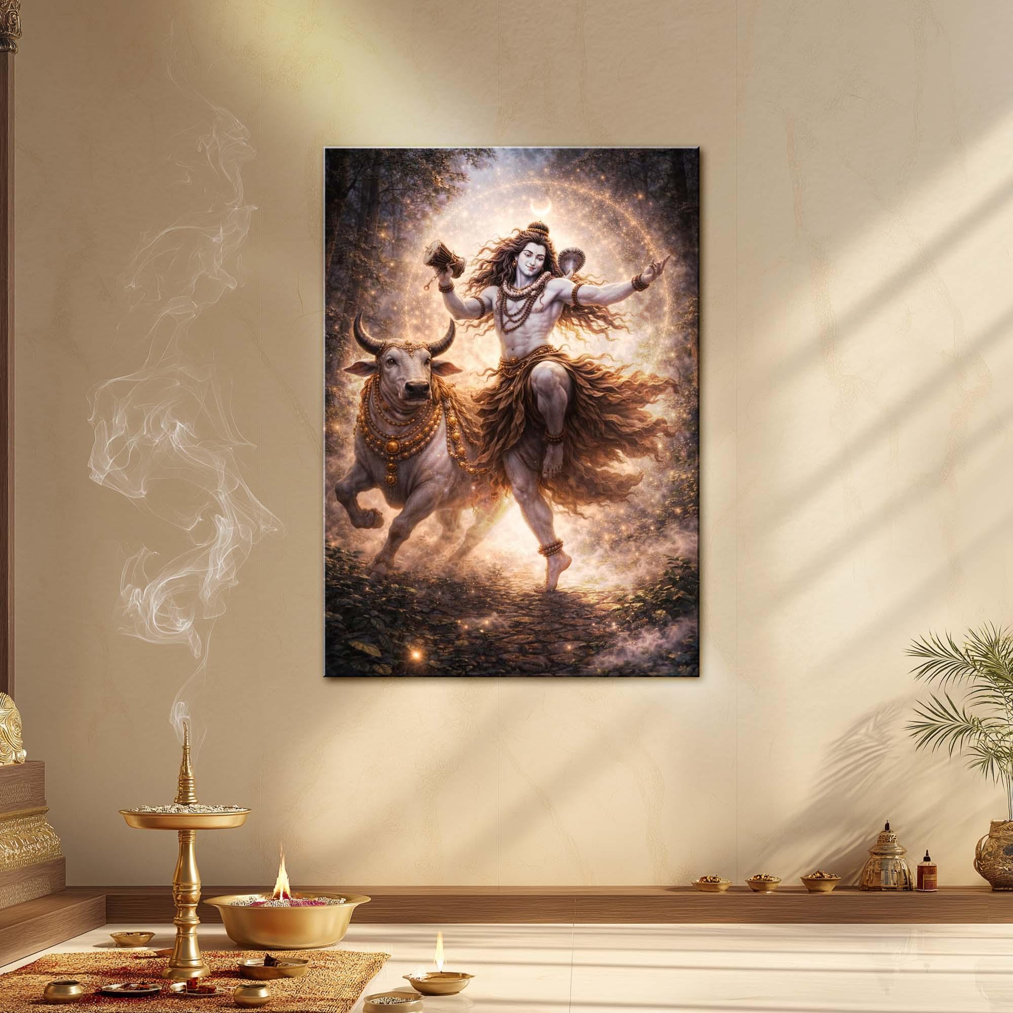 Nandi’s presence amplifies the spiritual intensity of the scene—grounded yet powerful—symbolizing discipline, loyalty, and the path of dharma that follows Shiva’s cosmic rhythm. The forested backdrop, glowing embers, and celestial light together create a mystical atmosphere charged with divine motion and sacred balance.