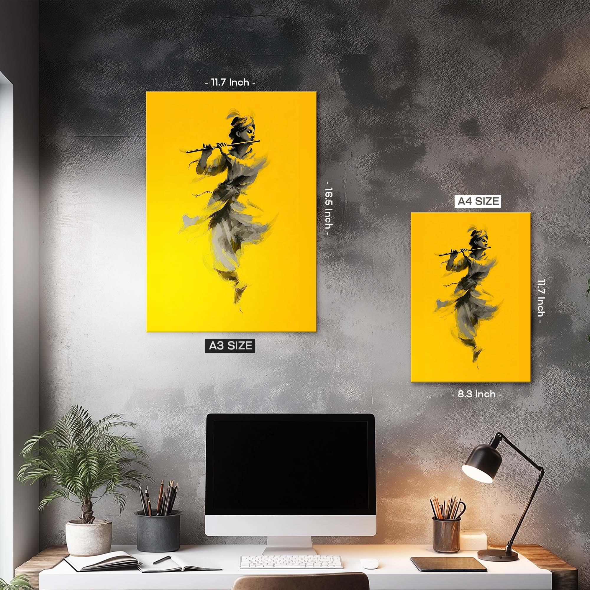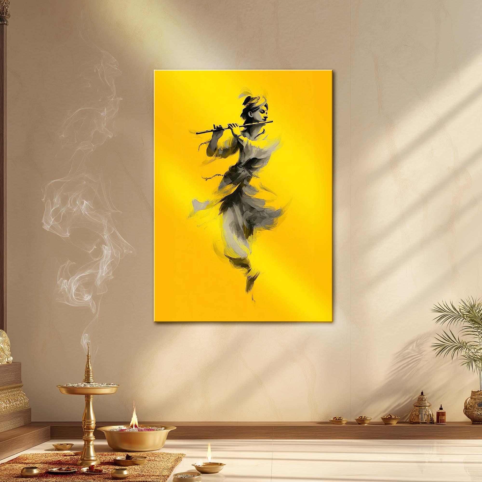 Set against a radiant golden-yellow backdrop, Krishna stands absorbed in the bliss of his flute, symbolizing harmony, infinite compassion, and the eternal music of the universe. The minimalist style gives the piece a contemporary charm, while the divine posture preserves the essence of devotion, making it a perfect fusion of art and spirituality.