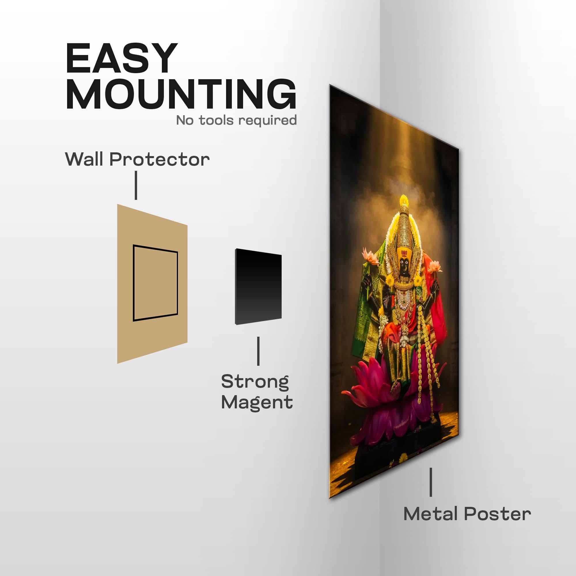 Holding lotus flowers in her divine hands, the Goddess blesses devotees with spiritual purity, material fulfillment, and unwavering protection. The lotus throne beneath her signifies victory over adversity—rising untouched from darkness into divine grace. Every detail of this artwork echoes the sacred power felt by millions who bow before her at the revered Karvir Peeth.