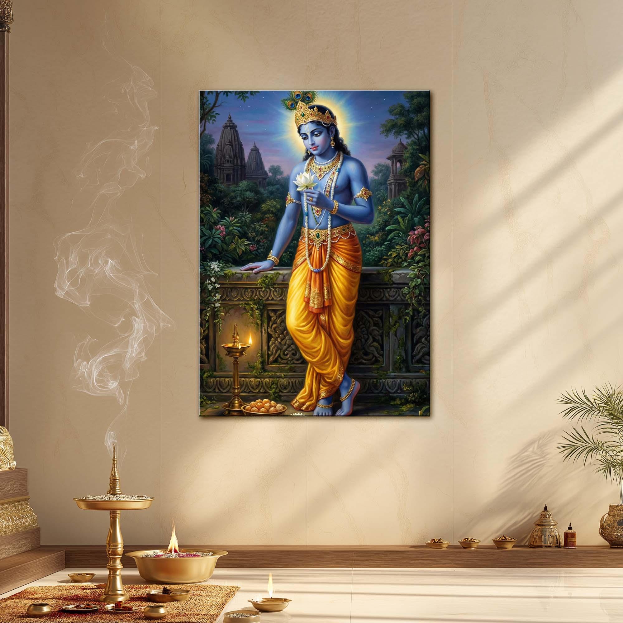 The gentle bend of His posture, the calmness in His eyes, and the softness of His smile speak of karuna (compassion) and leela (divine play). Behind Him, ancient temples rise amidst lush greenery, while glowing lamps and sacred offerings illuminate the path of devotion. The lotus He holds represents purity untouched by worldly illusion—just as Krishna remains untouched by maya.